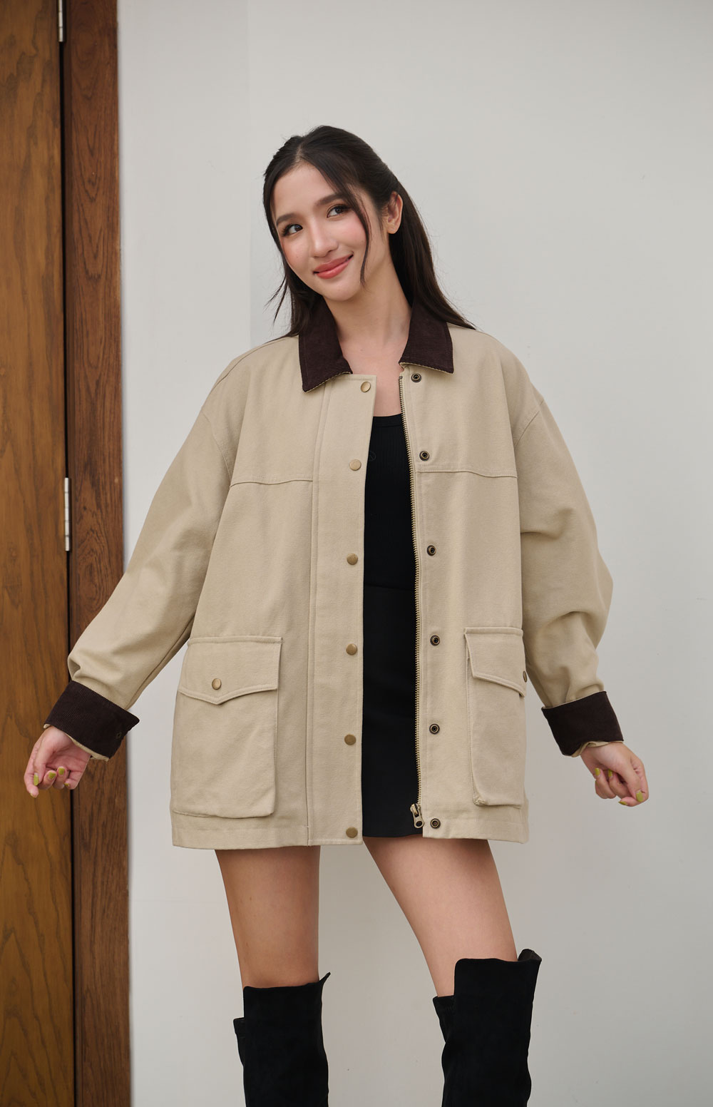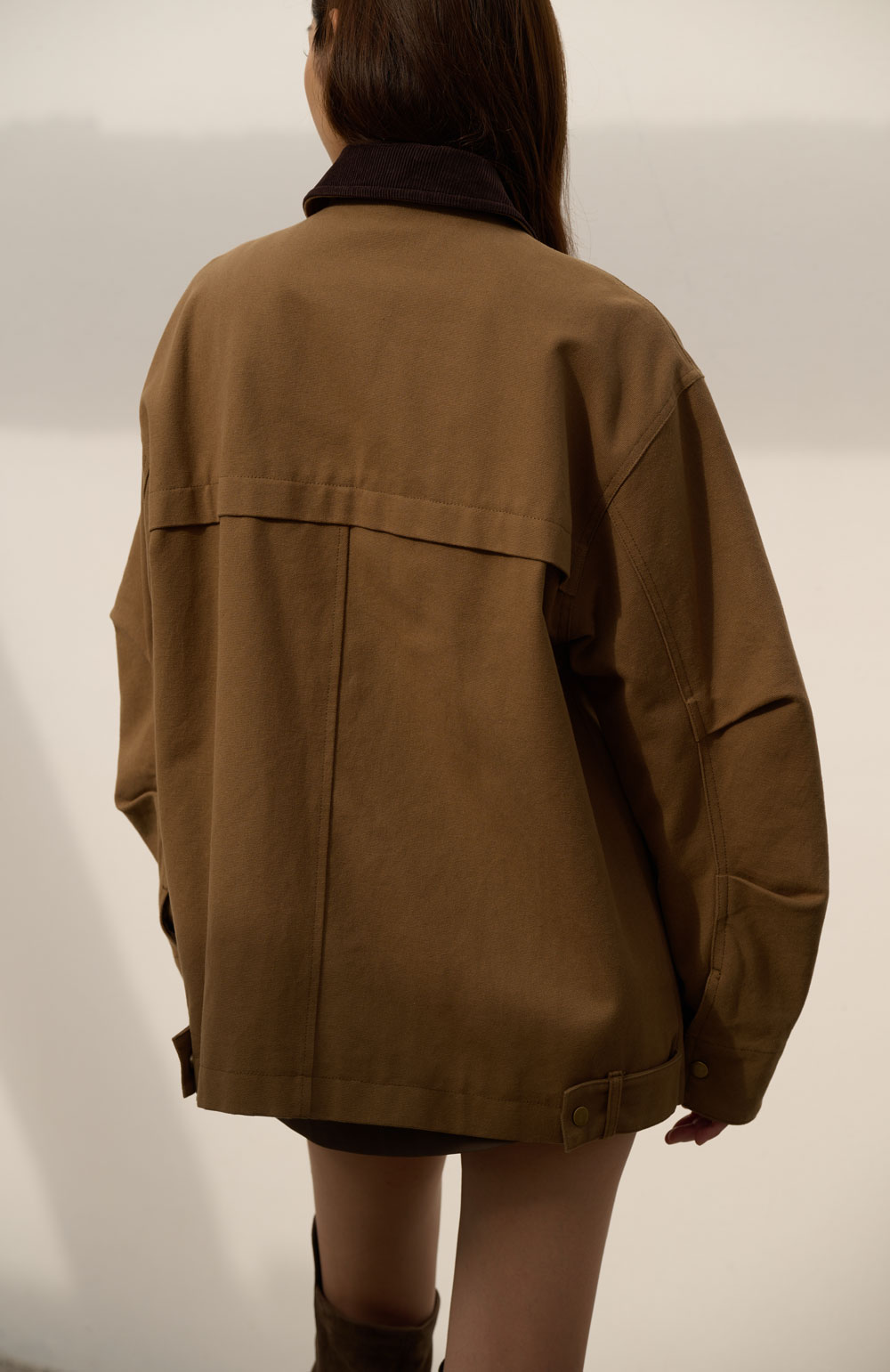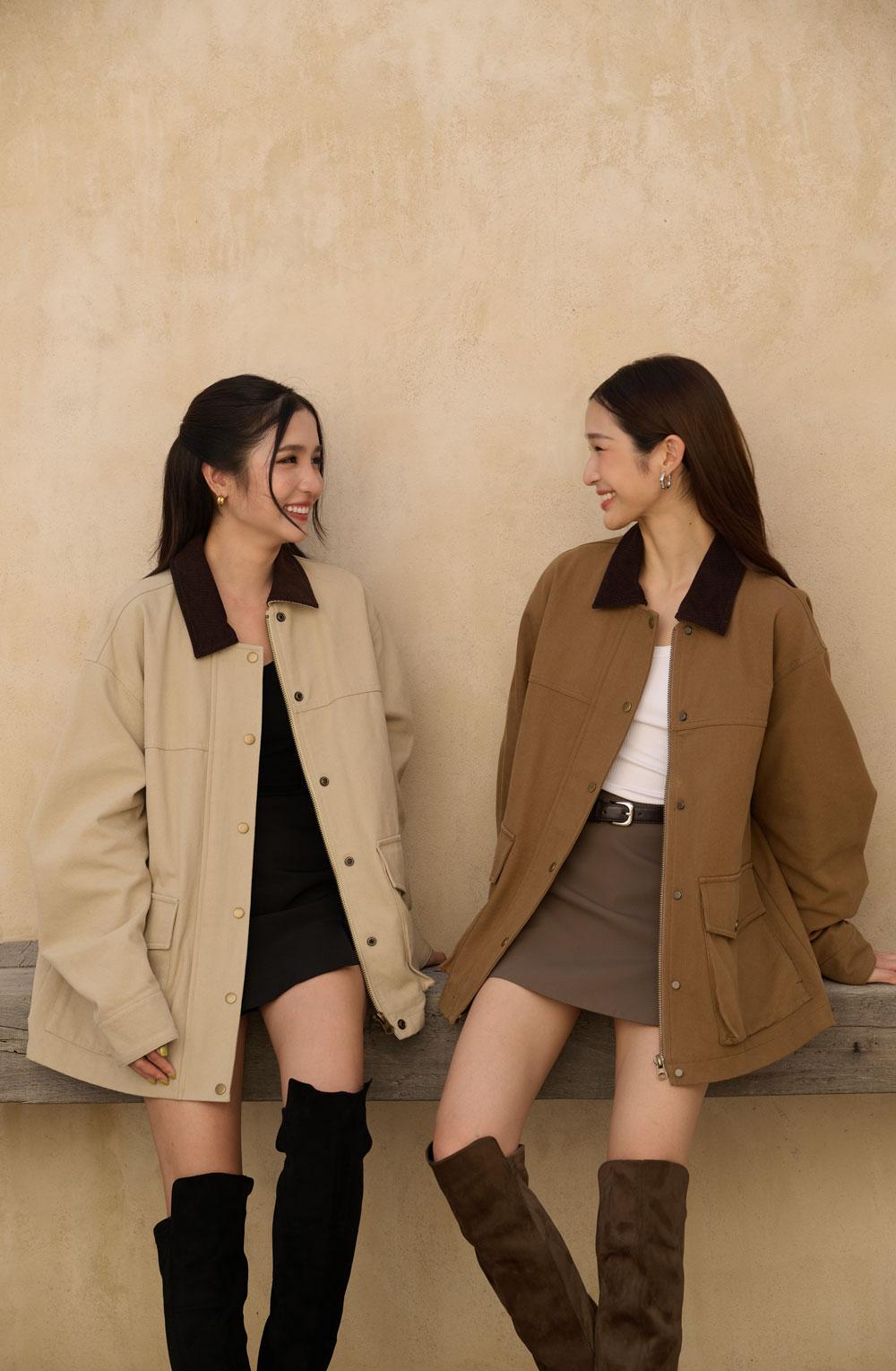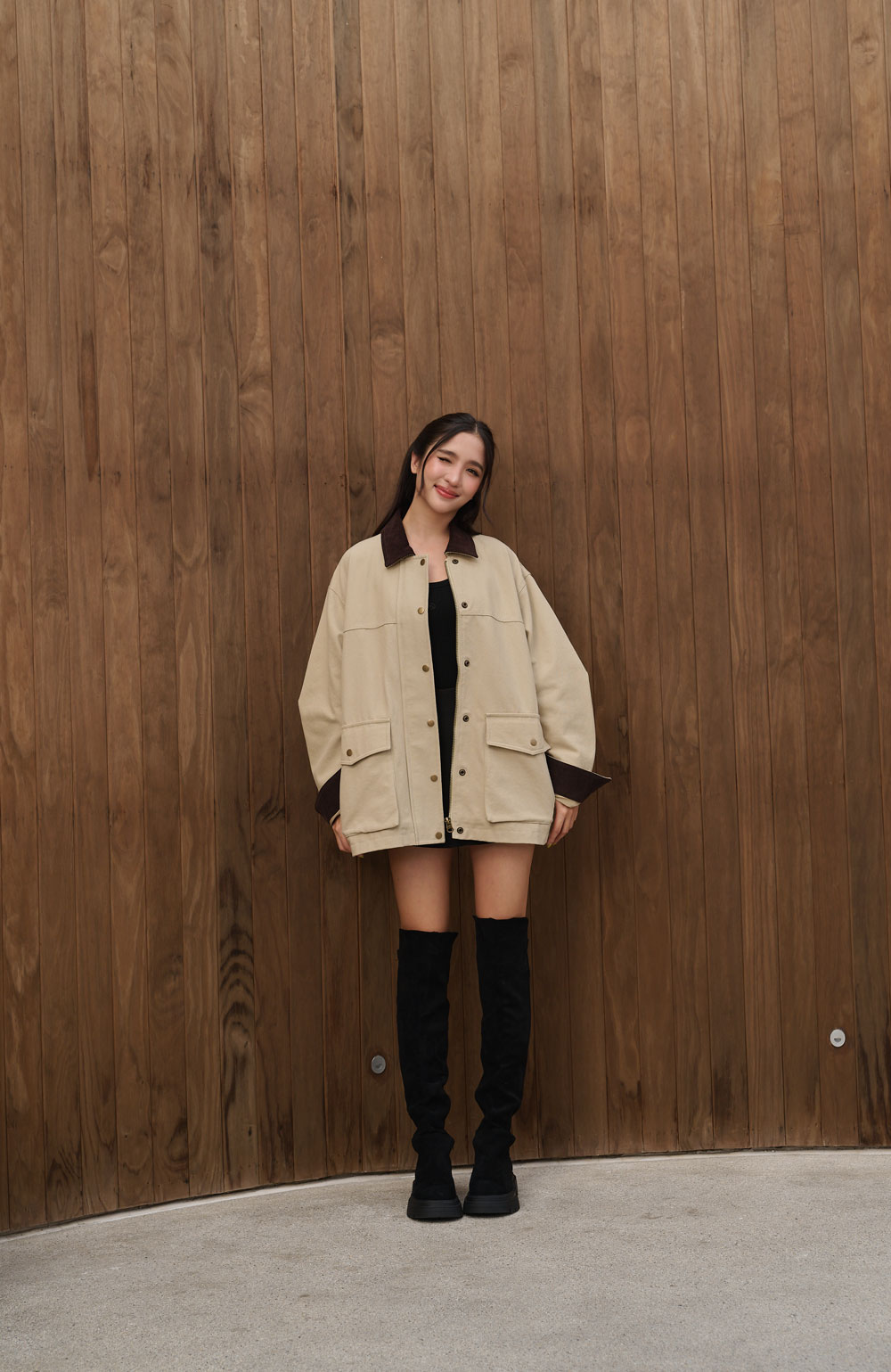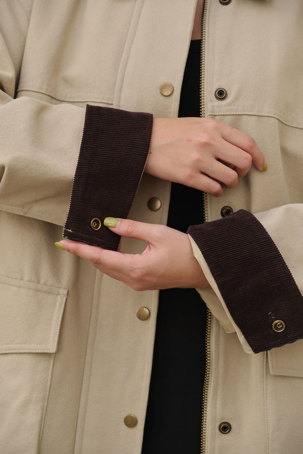 เสื้อแจ็คเก็ตผ้าพรีเมียมคอตตอน 100% ฟอก ทรงโอเวอร์ไซส์ใส่ง่าย สไตล์มินิมอลเท่ๆ มีดีเทลคอปกและปลายแขนผ้า corduroy เพิ่มมิติให้ลุคดูพรีเมียมขึ้นไปอีกขั้น พร้อมกระเป๋าหน้าและกระเป๋าข้างสองฝั่งใช้งานได้จริง กระดุมและซิปเกรดพรีเมียม แขนมีการออกแบบตัดเย็บให้โค้งสวยเวลาใส่