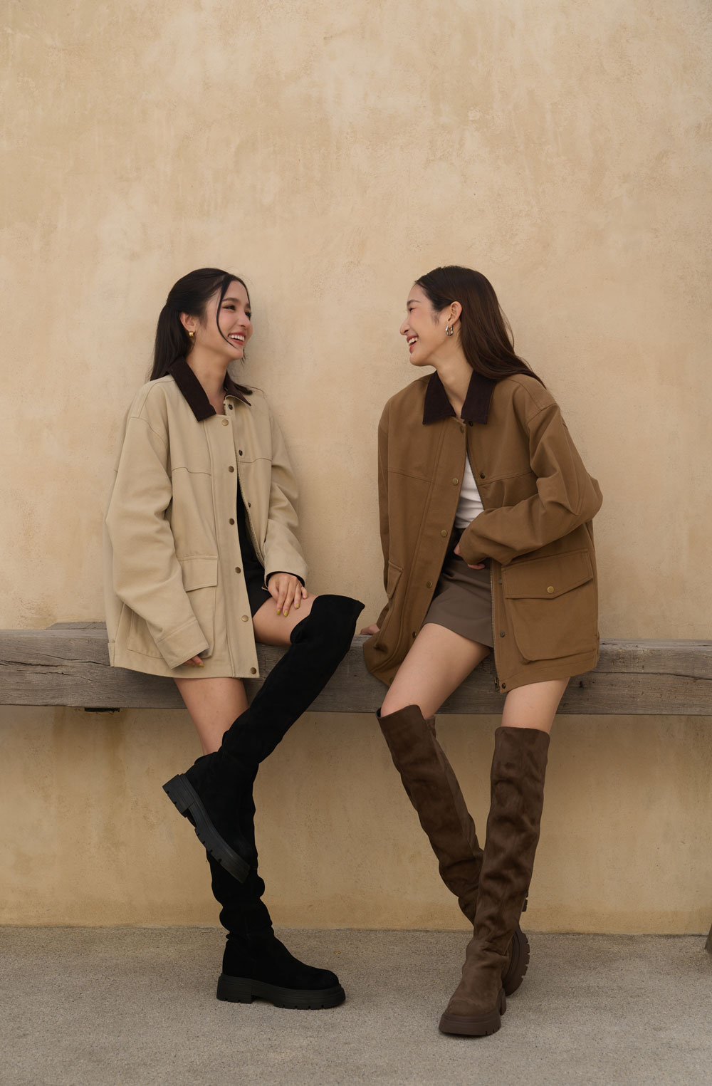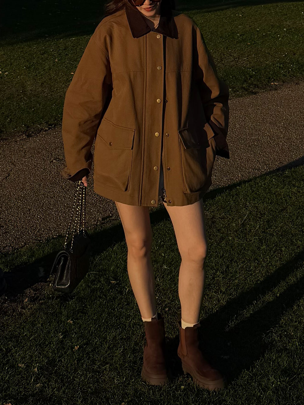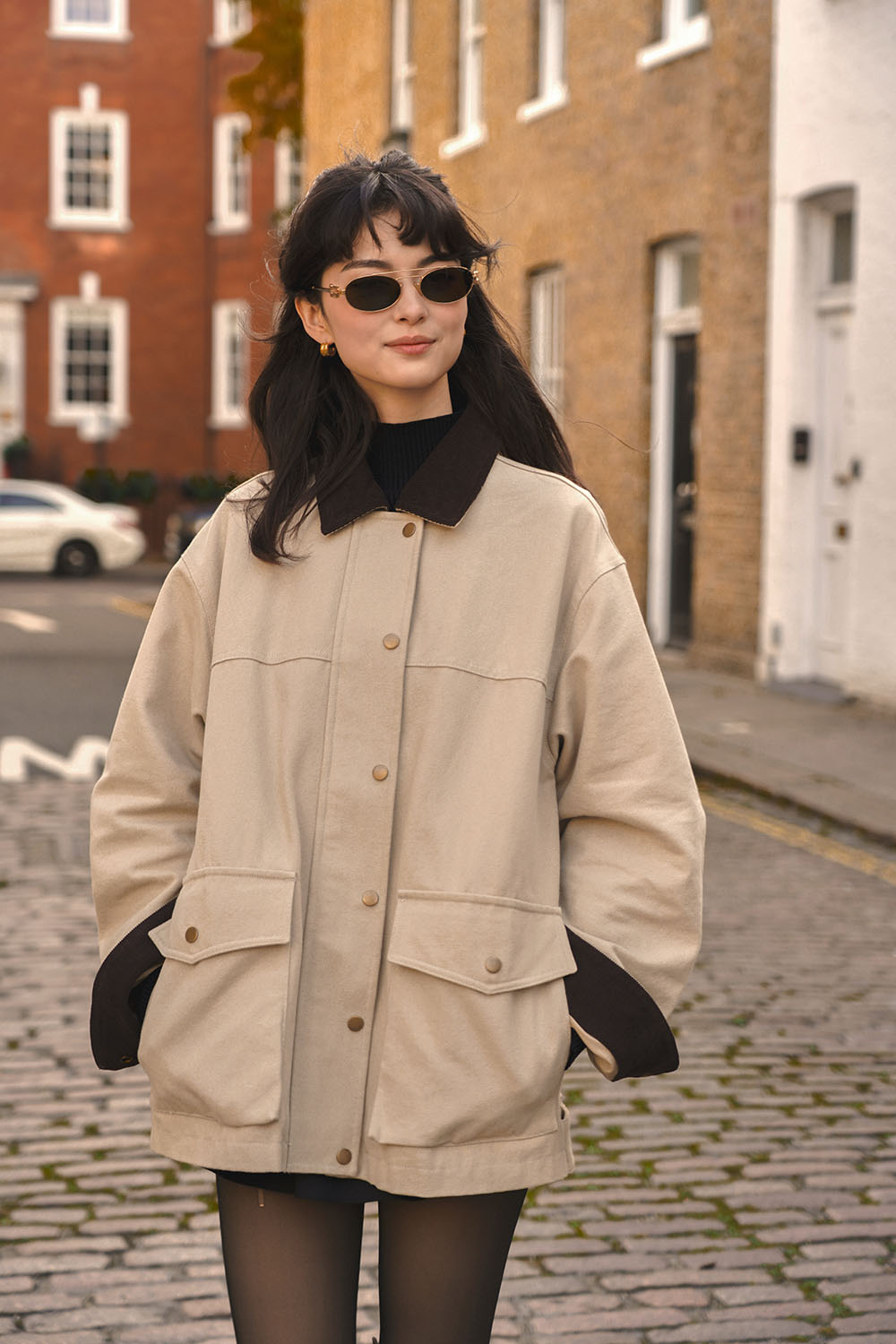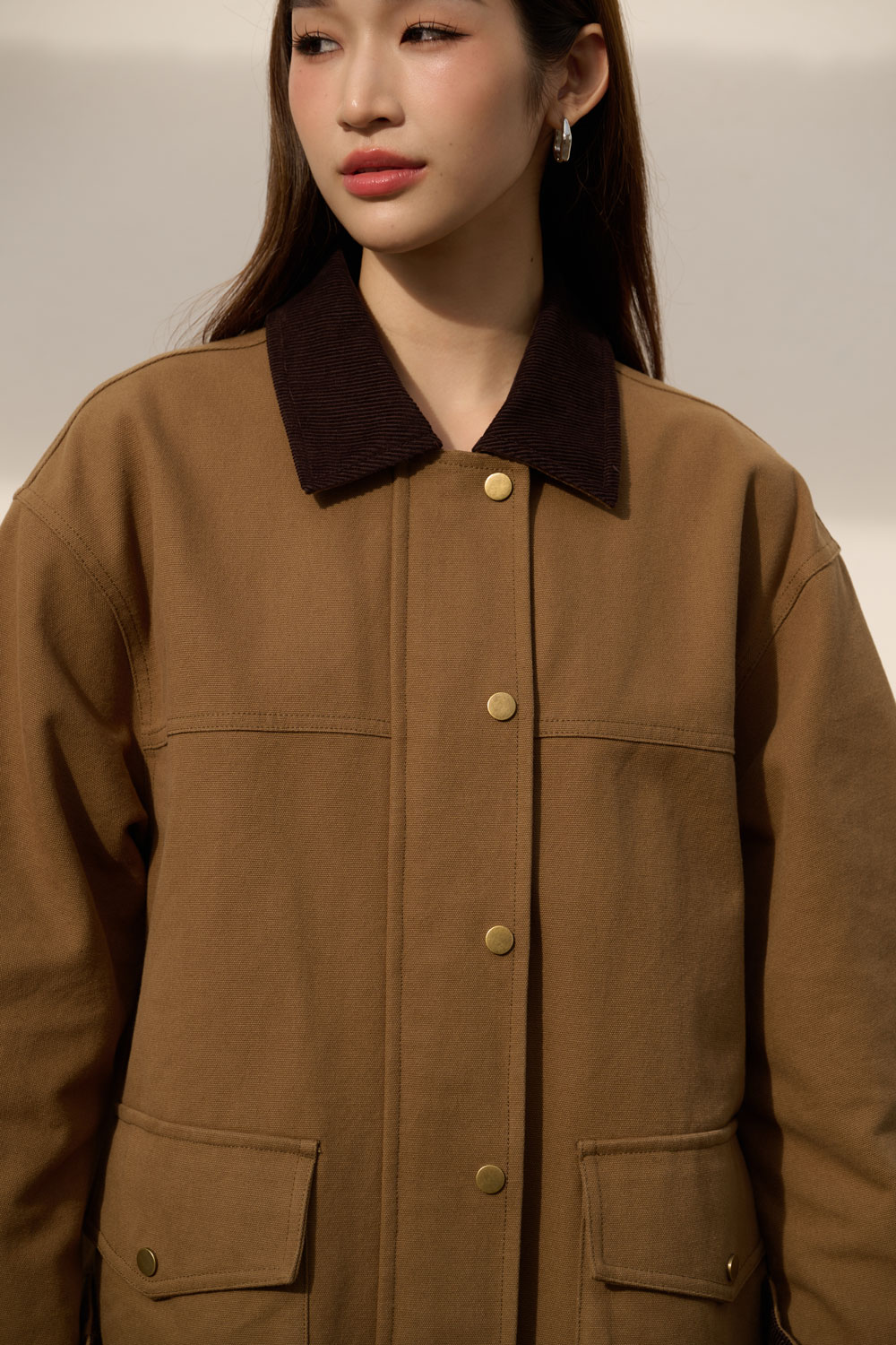 เสื้อแจ็คเก็ตผ้าพรีเมียมคอตตอน 100% ฟอก ทรงโอเวอร์ไซส์ใส่ง่าย สไตล์มินิมอลเท่ๆ มีดีเทลคอปกและปลายแขนผ้า corduroy เพิ่มมิติให้ลุคดูพรีเมียมขึ้นไปอีกขั้น พร้อมกระเป๋าหน้าและกระเป๋าข้างสองฝั่งใช้งานได้จริง กระดุมและซิปเกรดพรีเมียม แขนมีการออกแบบตัดเย็บให้โค้งสวยเวลาใส่